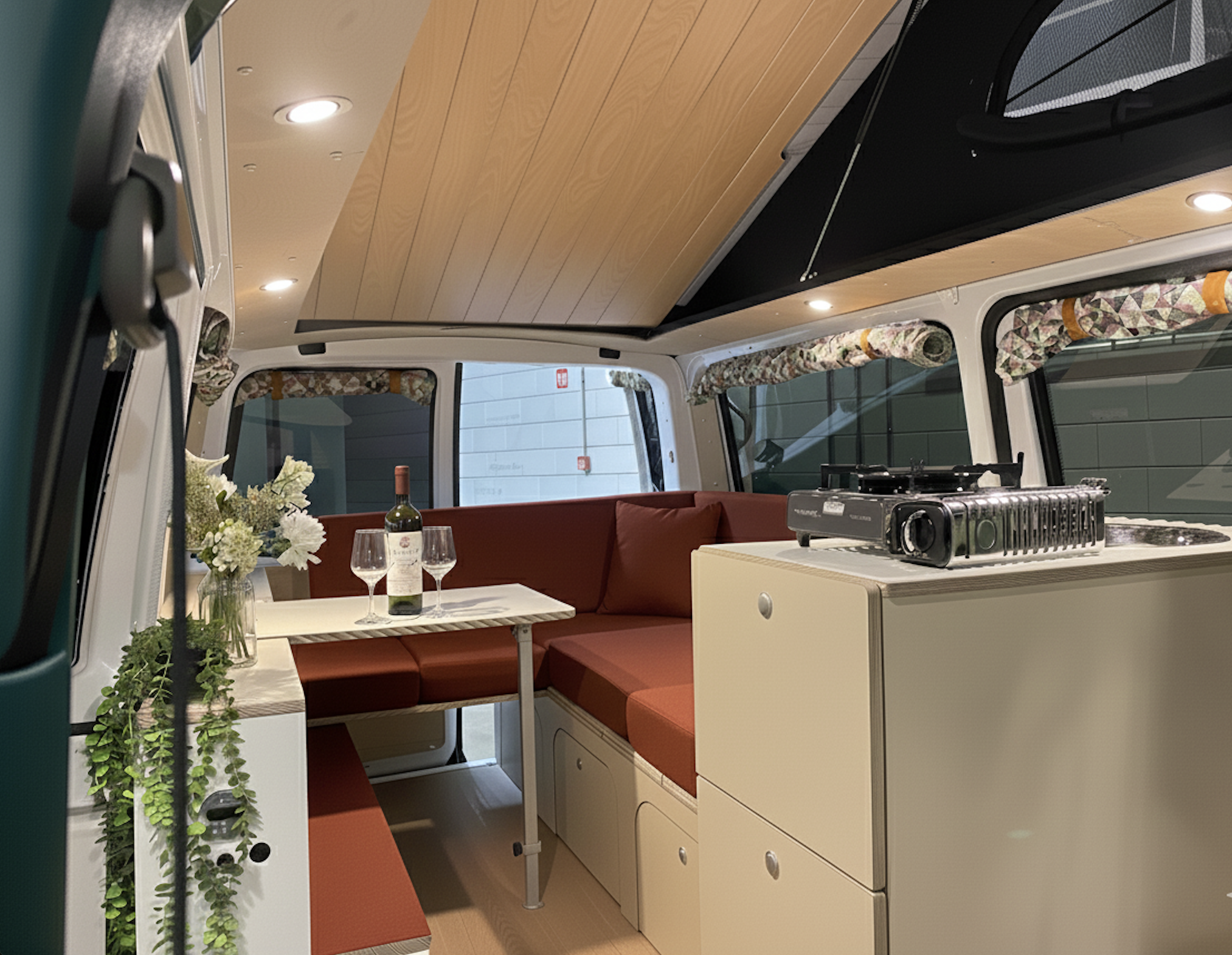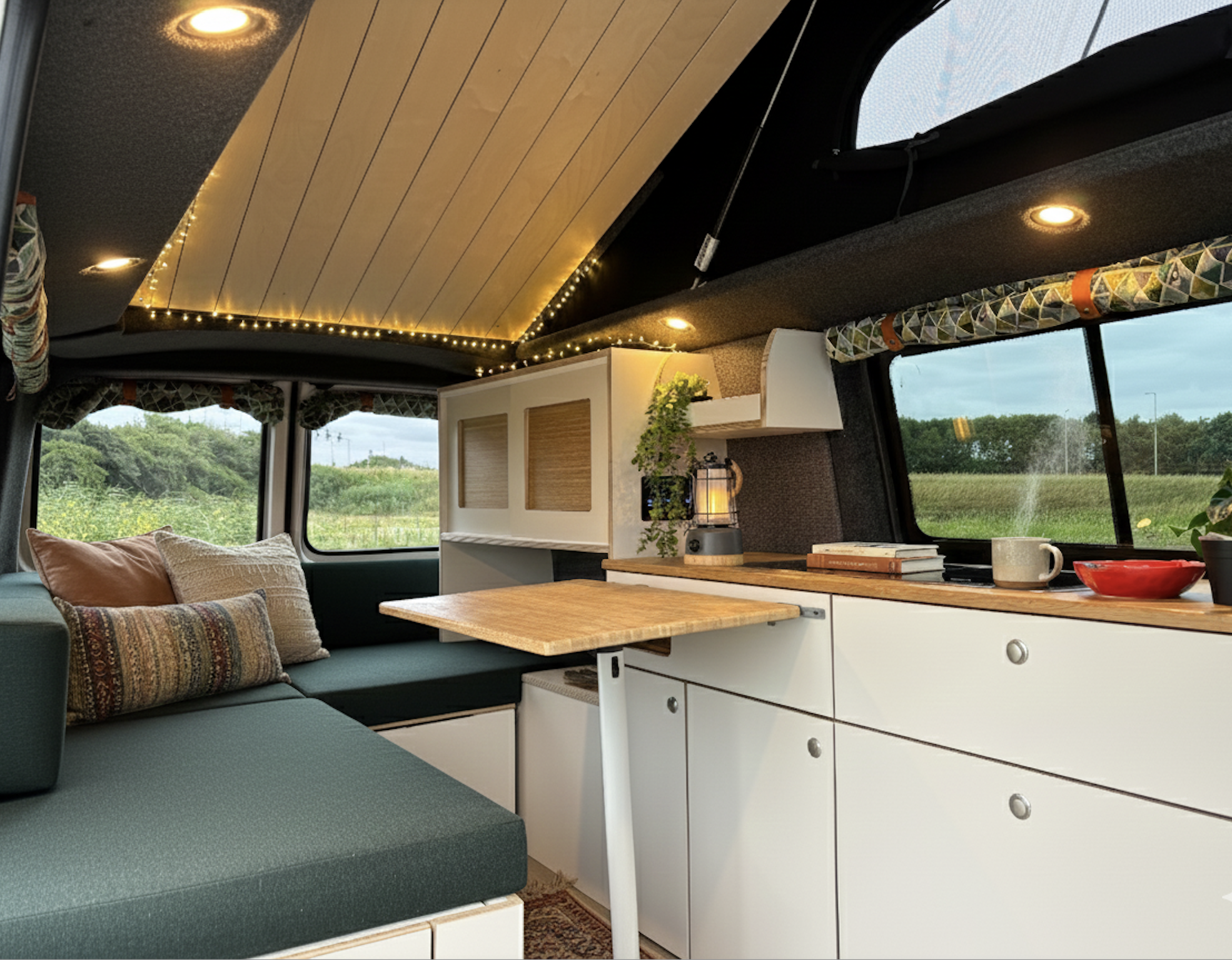 De buscamper heeft een slaaphefdak waardoor je stahoogte creëert in de bus en boven erin kan slapen. Deze bevat ook ritsen aan de voorzijde en zijkanten, zodat je deze open kan ritsen en daglicht in het interieur binnen kan laten. Multifunctioneel! Met een RDW gekeurd zit- en slaapbank kan je mensen vervoeren in je bus en tegelijkertijd deze bank ombouwen tot bed. We hebben ook een opberglade gerealiseerd onder de bedbank.